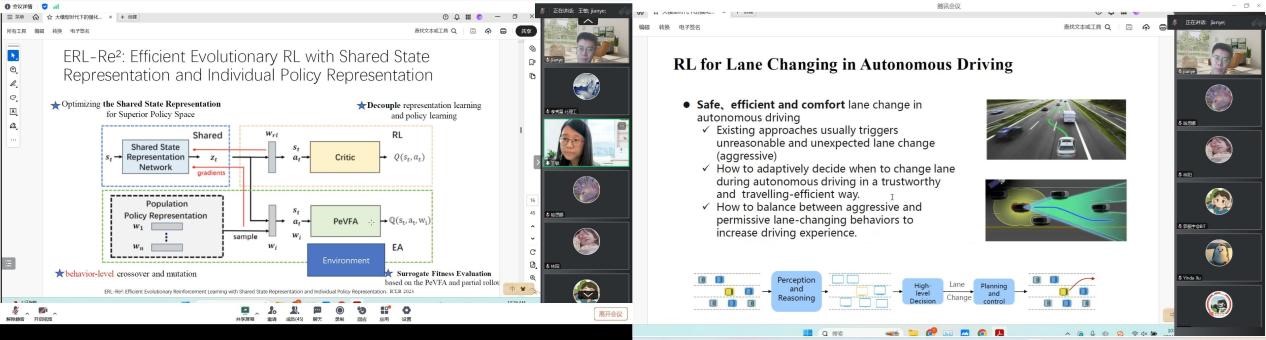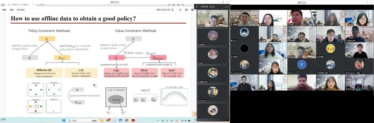郝建业老师首先回顾了传统的强化学习范式,即在线强化学习和离线强化学习,并探讨了在当前大模型时代下,传统的强化学习范式仍扮演着重要角色,在决策领域演化出“离线预训练”和“在线微调”的新型范式。立足于上述两种强化学习范式,郝老师分别从智能体与环境交互构建马尔可夫决策过程(MDP)的角度出发,讨论了在线强化学习如何利用策略表征、世界模型、数据增强和高效的探索策略采样高质量样本数据;以及基于Transformer和扩散模型等主干网络使智能体通过离线强化学习获得泛化性更好的策略。同时展示了其团队最新设计的包含5种人类反馈类型和30多种仿真环境、用于提升离线强化学习效率的通用平台——Uni-RLHF。此外,郝建业老师还探讨了如何将离线和在线强化学习技术结合,应用于具身智能、自动驾驶和芯片设计等实际工业场景,并分享了其团队成果在现实环境下的多个应用,例如部署在会议室中用于物品布置的机器人、部署在智能驾驶车辆中用于变道决策的多智能体、以及部署在芯片设计中用于元器件布局的优化工程。最后,郝老师总结了本次报告的内容,并结合切身体会向大家传授了在科研路途上的一些经验,在引发全场强烈共鸣的同时给予了大家深远的启示。