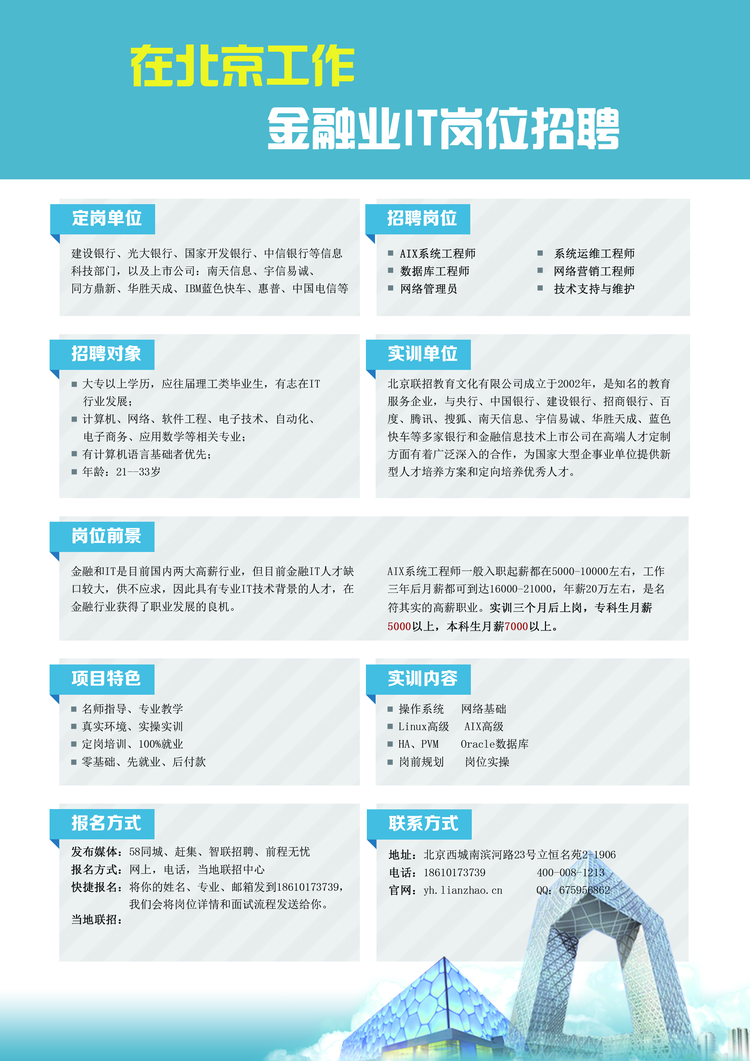 AIX系统工程师是银行、金融机构高级it岗位;发展前景大,工作年限越长,工资涨得越高,本次招聘机会难得,计划不多;实习生可以零基础!选择比努力更重要!机会就在眼前!
